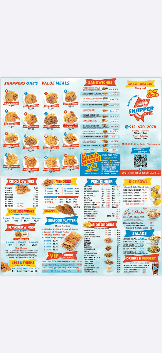 “ Clean, friendly and inviting the best food place I have ever been in this year, how did I miss this. Their chicken is clean no feathers left on the chicken wings like a lot of places. The food is seasoned to perfection and above all of that they don't cook your food until you order it, amazing!!! Last but not least the price is so affordable I can pay for my family and manage to fill my belly as well. If you have not been here Come asap this place is too good to believe. Come one Come all to Snapper1 in Jesup GA. ”